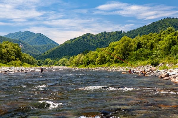 新潟県の村上市を流れる三面川。新潟と山形の県境に位置する朝日連峰から流れ出し、村上市の市街地を通って日本海に注ぐ。シロザケやサクラマスが遡る川としても有名で、アユも夏になると玉石底の澄んだ清流で天然ソ上の数釣りが楽しめる。釣り場は朝日まほろばICにほど近い水明橋から高速橋の周辺が有望。支流の高根川もソ上が多い。