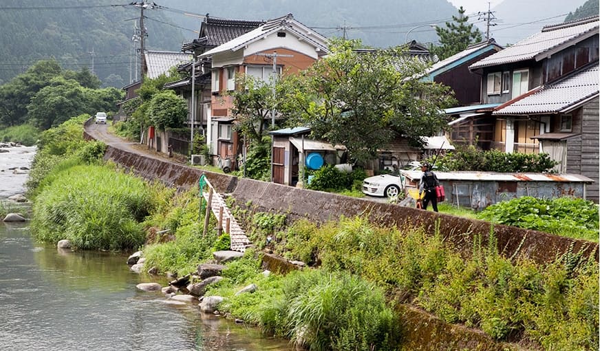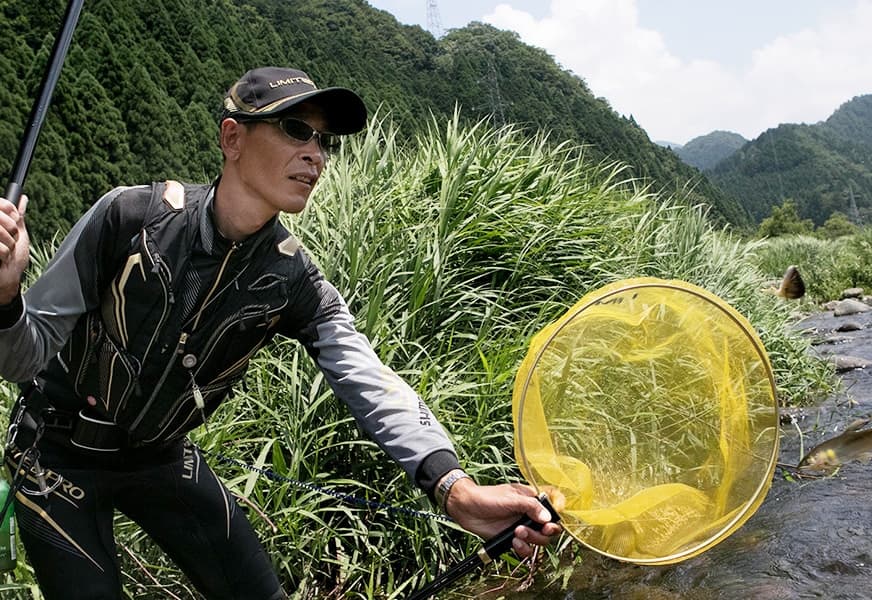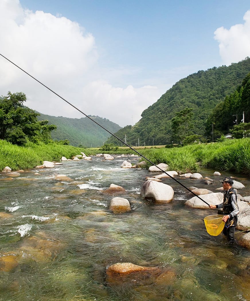 関西でも人気のアユ釣り場である兵庫県・揖保川。その山崎地区から、国道29号線を鳥取方面へ北上。曲がりくねる急坂を上り下りし、いくつかの峠を越え、山間の集落を抜けると、四方を山に囲まれた緑と清流の町・若桜に出る。
