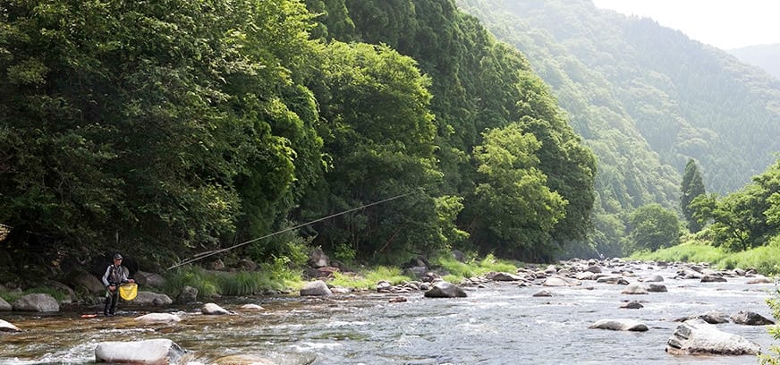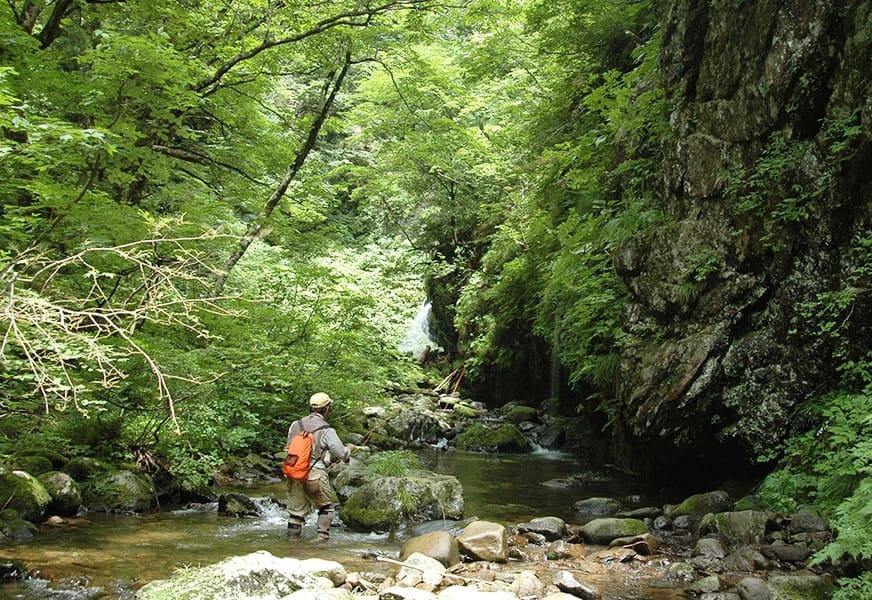 八東川の上流域は渓流釣りも楽しめる。地元の漁協により、ヤマメ、アマゴ、イワナ、ニジマスなどが放流されているが、上流部の支流でよく釣れるのはイワナ。こちらは上空に木の枝が茂っている比較的狭い場所が多いので、7フィートクラスの短めのフライロッドを使い、#16程度のあまり大きすぎない毛バリ(ドライフライ)でねらうとよい。なるべく魚を驚かさないように静かにポイントに近づき、周囲よりも水量がある小さな落ち込みにそっと毛バリを浮かべると、岩の陰からスーッと黒い影が毛バリに近づいてひと呑みにする。