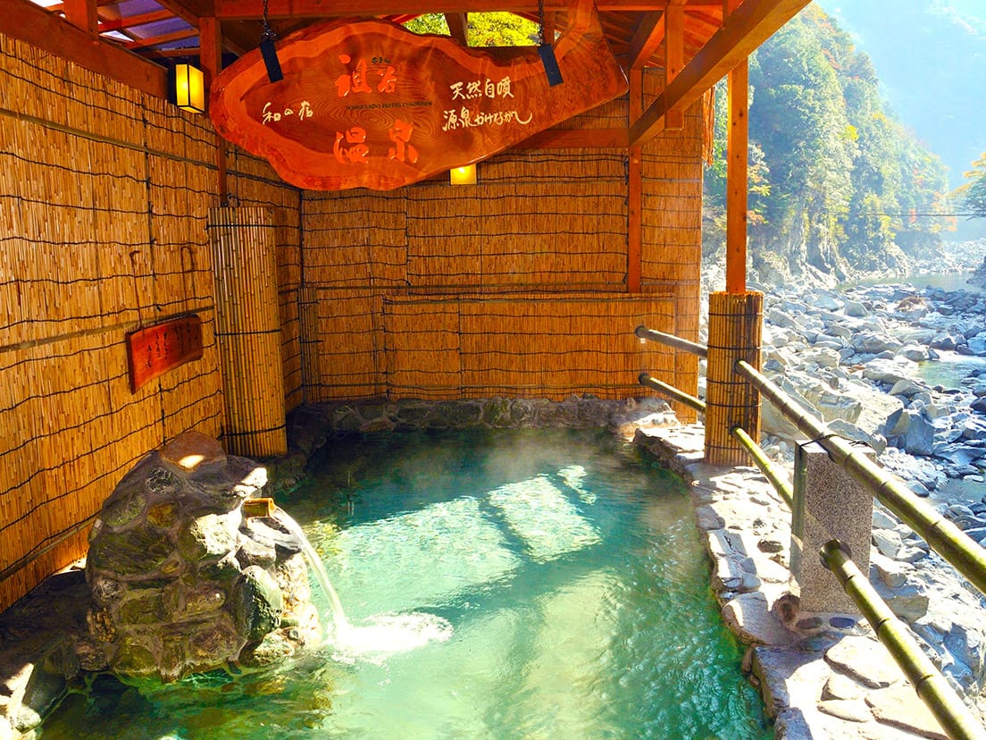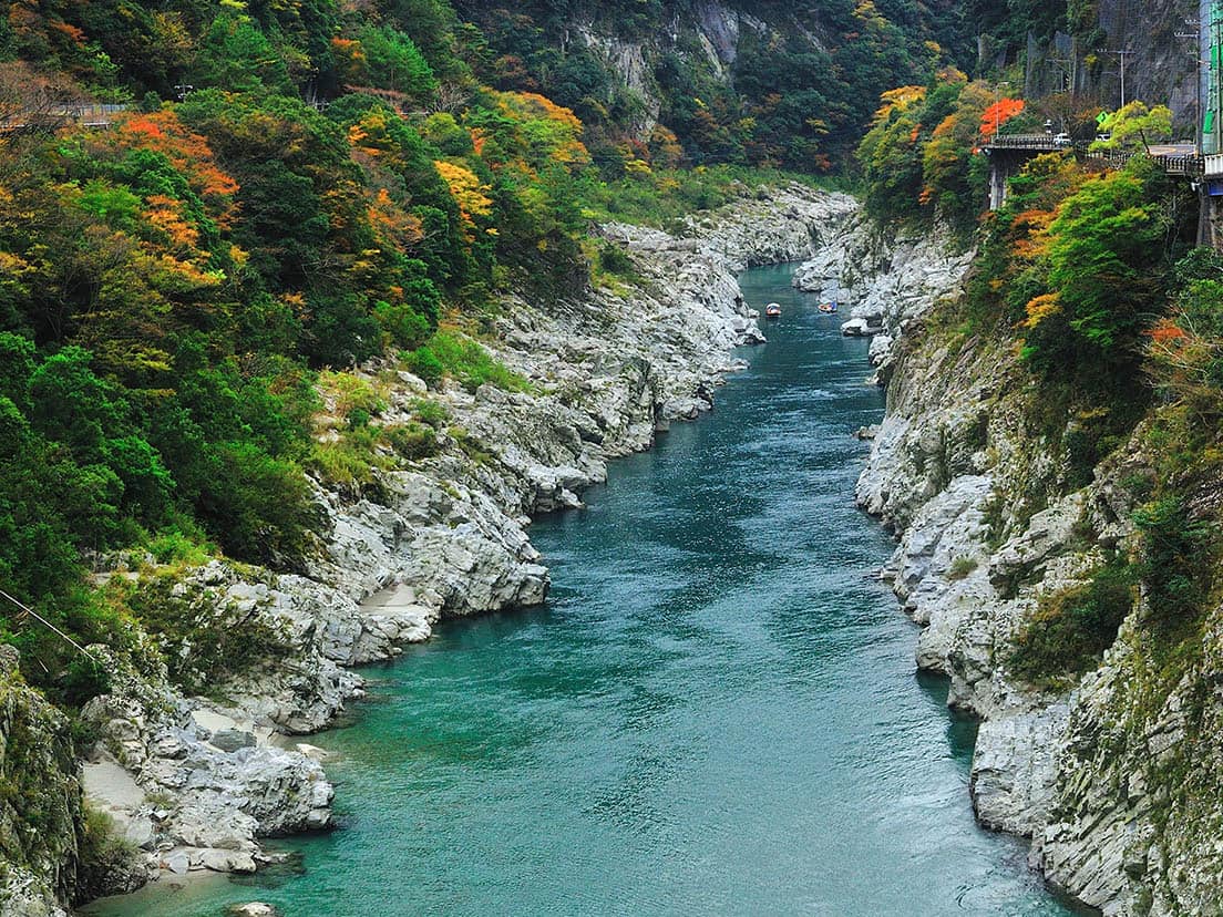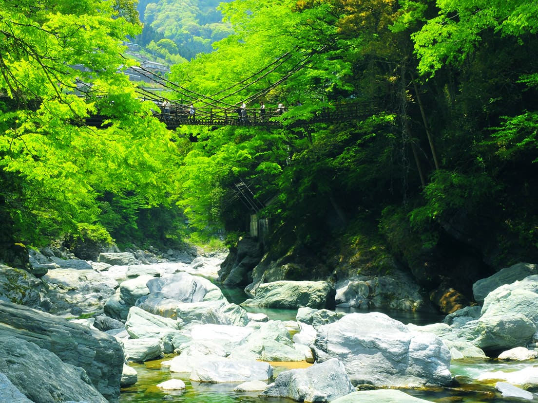 そんな吉野川の支流には、日本三大秘境に数えられる祖谷渓(いやけい)があり、深く切り込んだ谷の中には「祖谷温泉」があります。周辺には日本三奇橋に数えられ、国の重要有形民俗文化財にもなっている「祖谷のかずら橋」などがあり、散策で小腹が空いたら、険しい山間の地で代々受け継がれてきた祖谷そばを味わうといった時間が過ごせます。