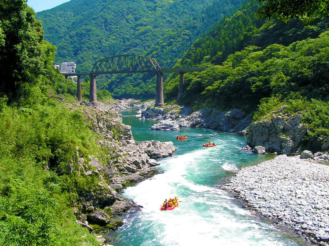 流域の三好市には、経験豊富なインストラクターがガイドする複数のラフティングガイドサービスがあり、初めての体験者にも十分に配慮したプランのもと、誰でもダイナミックな川下りを体験することができます。半日コース、1日コース、ファミリーコースなど複数あり、流れの緩やかな場所では、川に飛び込んで泳ぐといった遊びもできます。