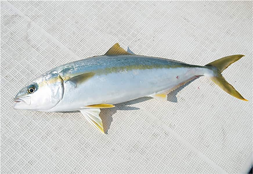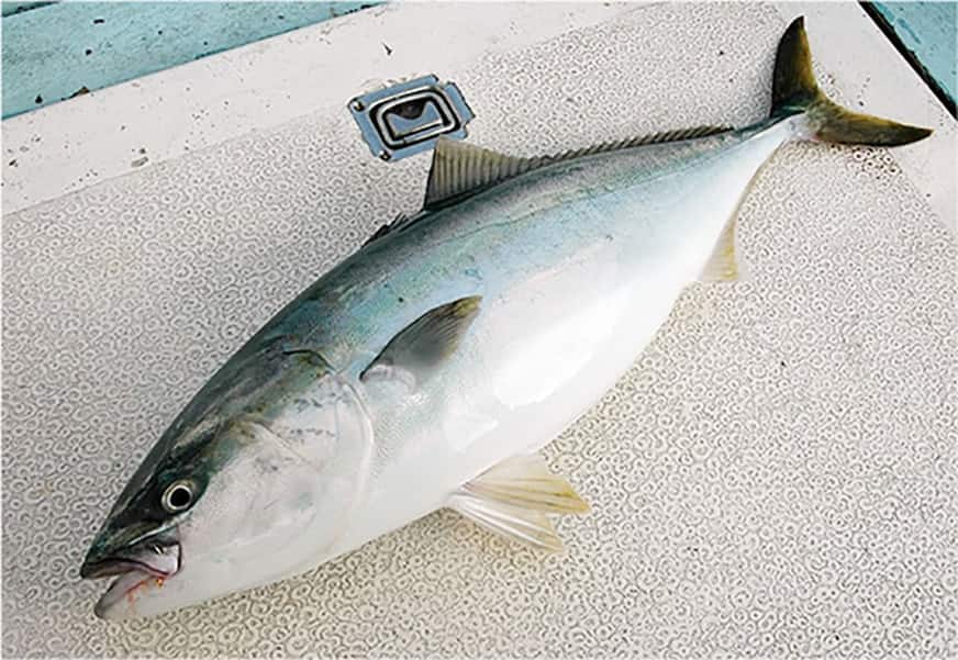 “青もの”も人気の対象魚。カンパチはやや深いところ、ブリやヒラマサは、マダイより浅い場所を泳いでいることが多く、いずれもハリに掛かるとイケスの中をものすごい力で走り回ります。エサは小魚によく反応します。