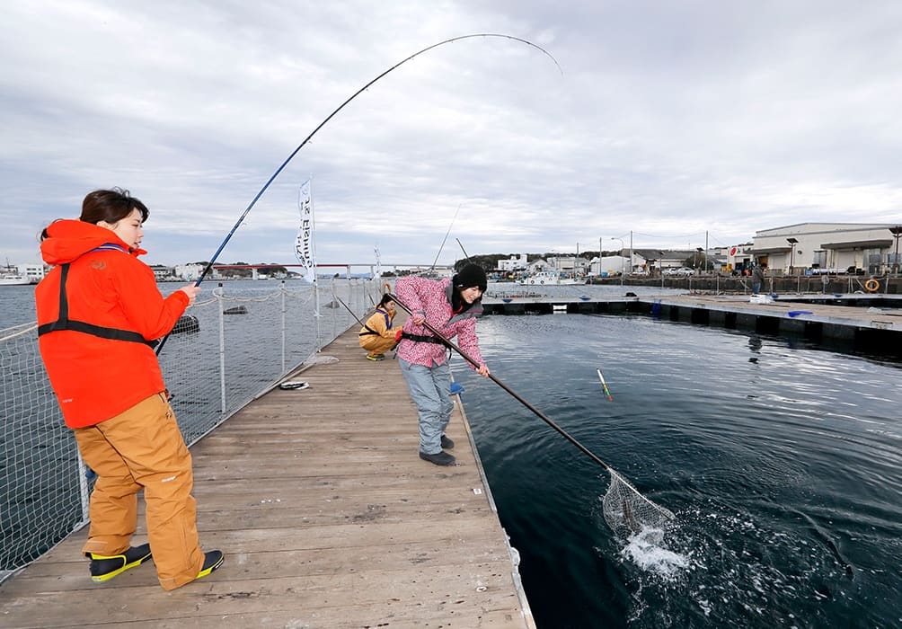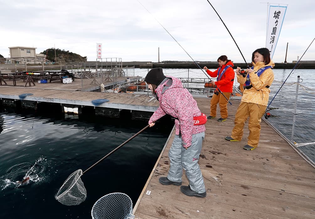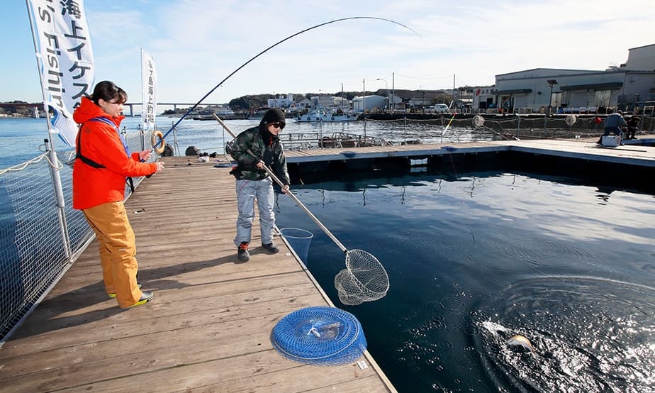 海上釣り堀では、リールザオでのウキ釣りが基本。エサの付いた仕掛けが魚のいる場所まで沈み、魚がエサをくわえると、ウキが海中に引きこまれるので、そのタイミングでサオを立てます。うまくいくと、魚がグイグイと引き込むので、あとはリールを巻いて、魚を海面まで引き上げます。最後は用意されているタモで魚をすくいあげればOK。