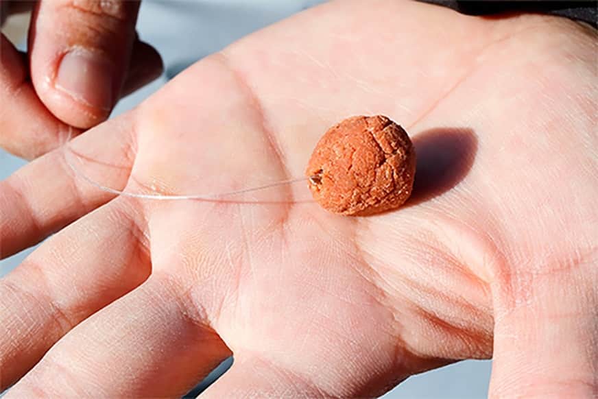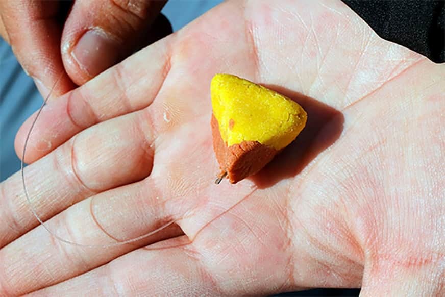 練りエサは、ハリが完全に隠れるようにしっかりと固めるのがコツ。球形に丸めて付けると水中で均等に溶けてゆっくり動き、ピラミッド型に固めるとヒラヒラ動きながら下降して端の部分から早く溶けます。付け方を変えるのは、魚の反応が止まった時に有効です。また、練りエサならではの方法として、別の色のものを組み合わせて使うのも効果があります。