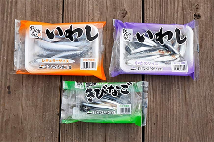 よく使われるエサは、大きく分けて3種類。「練りエサ」「エビやオキアミ」「イワシなどの小魚」です。小魚は生きたものを泳がせて使う場合もありますが、釣りエサ用に冷凍されたものが販売されています。そして、エサはどれもハリに正しく付けることが大切です。