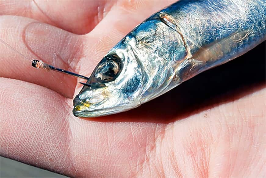 イワシやキビナゴなど、冷凍保存された小魚のエサを使う場合には、目の下に横方向からハリを刺し入れて、反対側に抜いて固定します。静かに漂わせる以外に、たまにチョンチョンと引っ張って、わざと動かしてみるのも効果があります。
