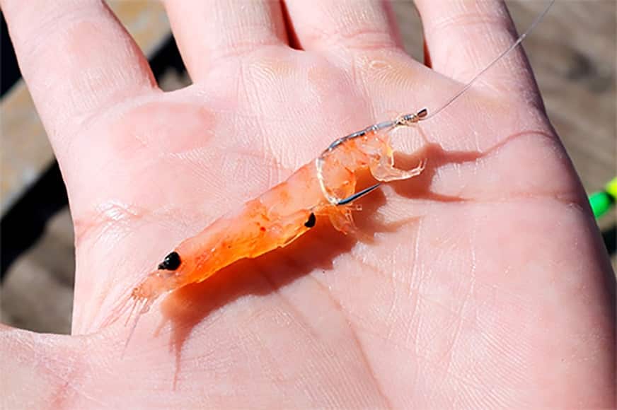 - オキアミは、尻尾を切り落としたところからハリの先を入れ、途中でハリ先を外に出して、写真のようにセットします。ハリの軸に対してまっすぐにすることで、海中で余計な水流抵抗を受けず、エサが不自然に回転しない効果があります。