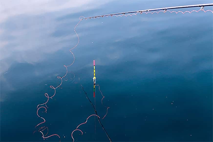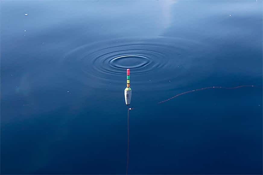ウキは最初、海面に寝た状態になり、やがて仕掛けが沈んで、ハリやオモリの重さが乗ると海面に立ちます。魚がエサに食いつくと、ウキに何かしらの反応が現われます。