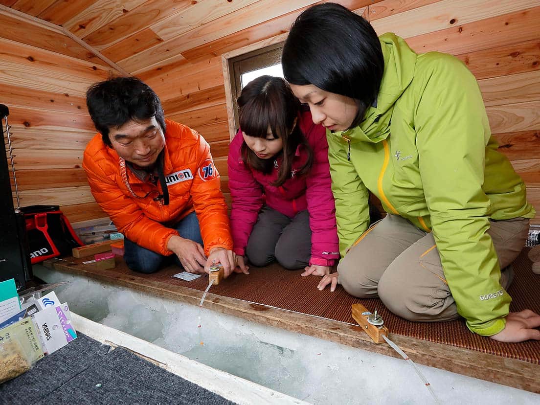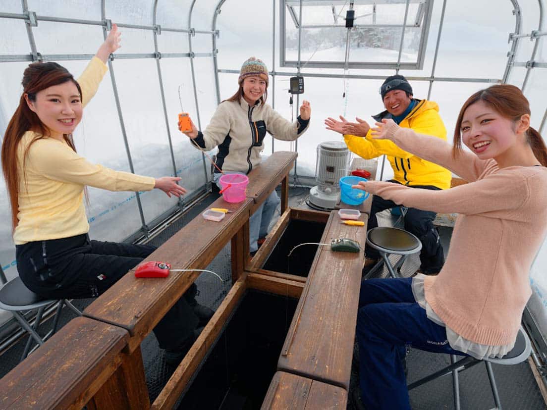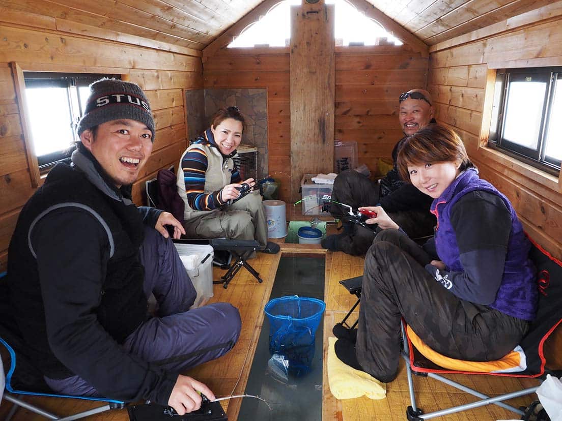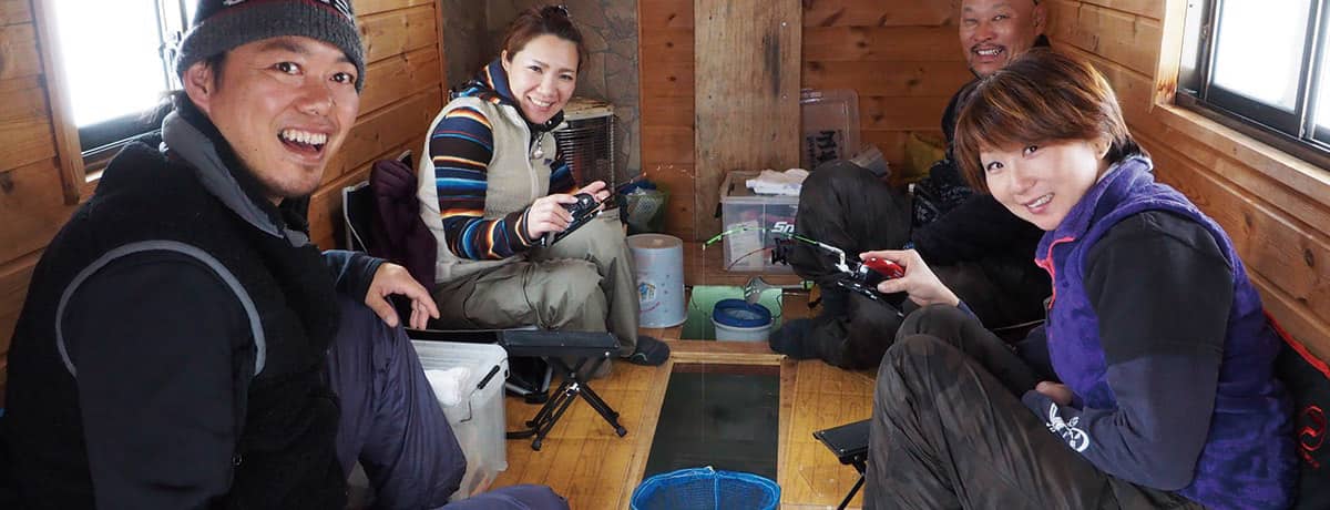桧原湖のワカサギ釣りは秋から楽しめますが、体験のユニークさも含めて人気が高いのは冬です。例年、1月下旬から3月末まで、湖面が完全に結氷すると、冬のワカサギ釣りの風物詩といえる氷上からの釣りが楽しめるようになります(開始時期は湖の結氷具合により変動します)。そして桧原湖の場合、屋形船、ドーム船、ハウス(釣り小屋)などと呼ばれる、それぞれ暖房の利いた快適な空間で、誰でも気軽に氷上のワカサギ釣りを楽しめるのが大きな特徴になっています。