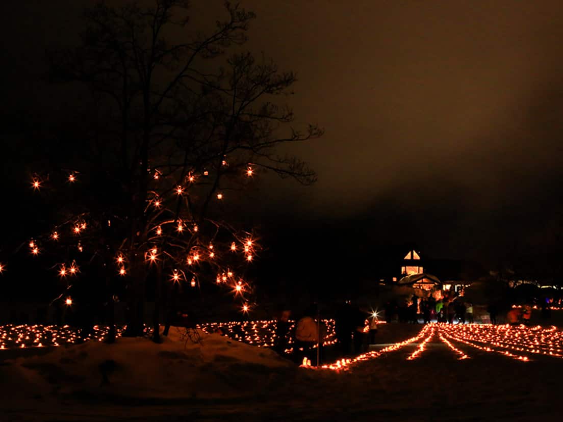 また、毎年2月の第3土曜日には「裏磐梯雪まつりナイトファンタジー」が開催されます。こちらは、日中はスノーシュートレッキングや雪のすべり台などの体験コーナーが会場に用意され、夜は3,000本におよぶキャンドルの点灯や打ち上げ花火が行われて、光のイルミネーションが見られるというもの。冬の桧原湖は、体験も観光もユニークな出会いが待っています。