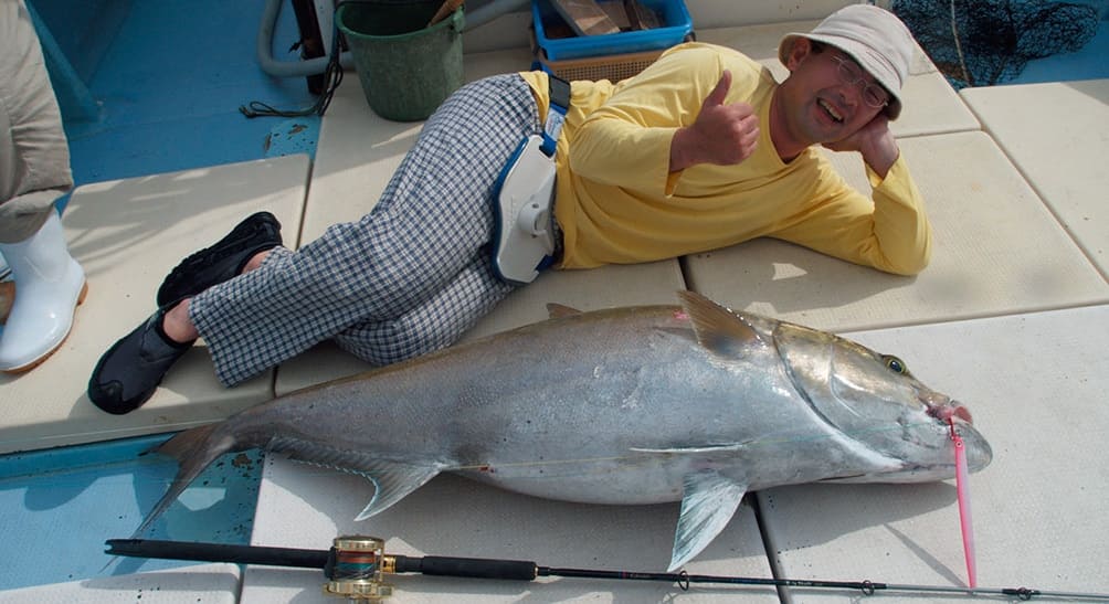 カンパチは大きくなるだけでなく、その圧倒的なパワーに特徴がある。ブリやヒラマサよりも体高があり、魚体は全体に丸みを帯びた太い砲弾型。そしてハリに掛かったあとは、磯や根に向けた下方向への強烈な突っ込みを見せる。10kgを超えればそのパワーは怖ろしさも感じるほどで、そして南西諸島や沖縄では、それをはるかに上回る40kg、50kgというクラスも釣られている。