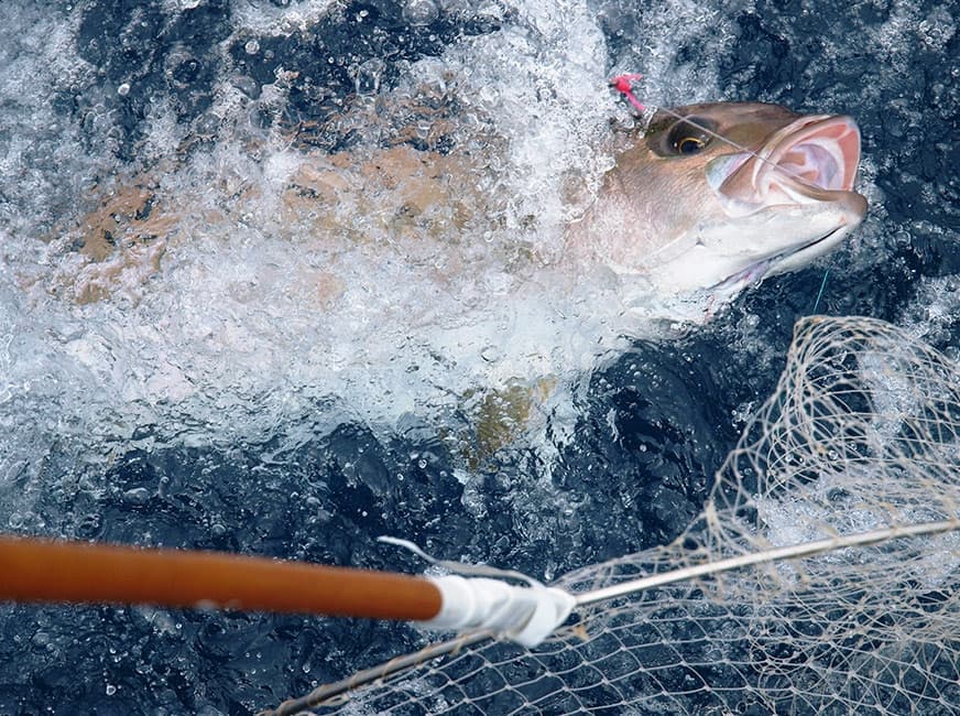 カンパチは主に水深20~70mに生息しているとされてきたが、実際にはさらに深い100~300mの場所でも釣られている。この遊泳層の広さもブリやヒラマサに見られない特徴で、泳がせ釣りという生きエサによる大ものねらいのほか、重たい金属製のルアーを深場に落とし込んでアクションさせ、その刺激で食い付かせるジギングでも好対象魚となっている。深場のカンパチねらいは〝速く強く〟が基本とされ、他の対象魚をねらうジギング以上に釣り人の体力やテクニックが試される。その難しさもまた一尾の価値を高めている。