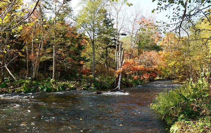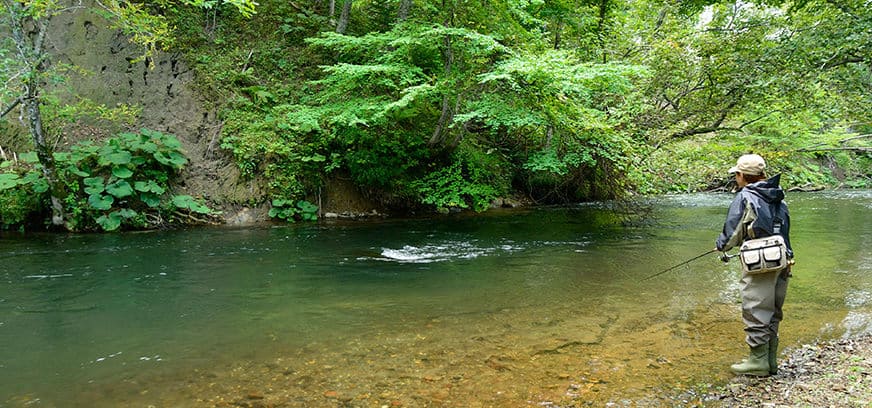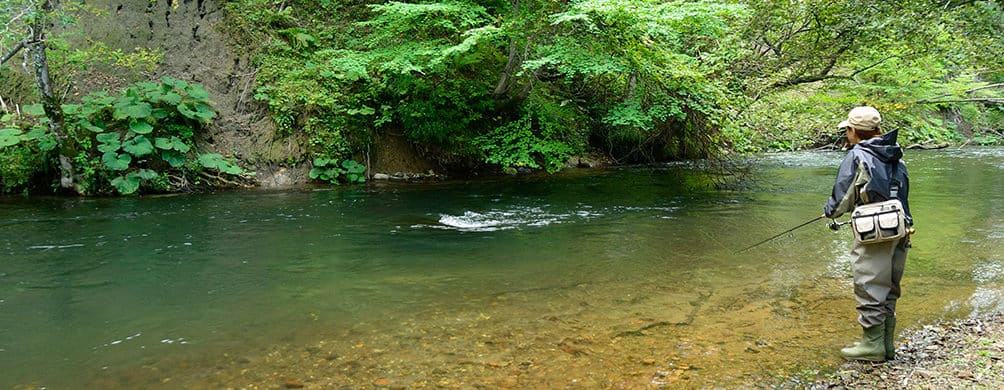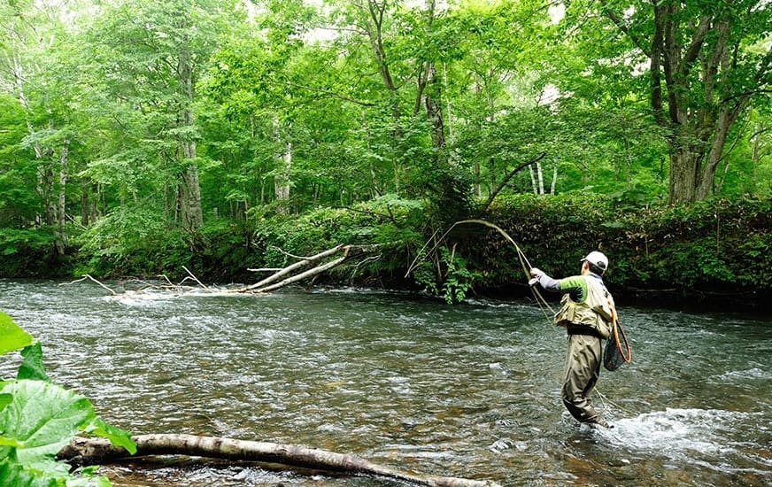 渓相の素晴らしさも群を抜いている。バイカモがゆらめく清澄な流れは蛇行を繰り返し、コケが生えた倒木や岩盤が随所に見られる。遡行していくと「次はどんなポイントなのだろう?」と期待に胸が高鳴り、体力の消耗を忘れてしまうほど。そうした背景から訪れる釣り人も多く、フィッシングプレッシャーは高い。さらに、岸際に障害物が目立ち、複雑な反転流が絡み合う場所が少なくなく、狡猾な大ものをキャッチするにはテクニックが求められる。しかし、それも阿寒川の面白さといえるだろう。