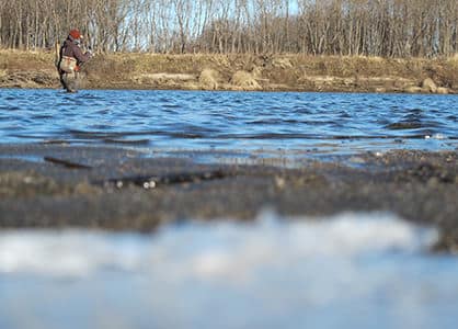 流れに立ち込まず、岸からロッドを振る場合もある。
