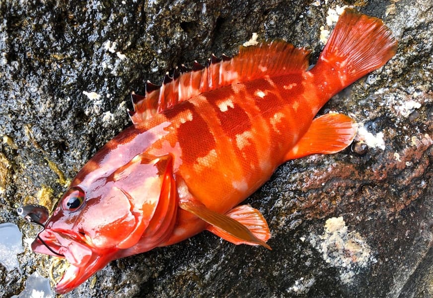 田子の沖堤防に限らず、近年は西伊豆全体でアカハタやオオモンハタ、キジハタなどハタ類の釣果がかなり増えていることも見逃せないトピック。なかでもオオモンハタは50cmクラスも期待できる。
