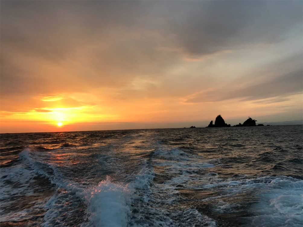 土肥や黄金崎、松崎など、西伊豆全域に散らばる温泉も釣りの充実度をさらに高いものにしてくれる。釣りを終えたあと、海を眺めて川のせせらぎを聞きながら入る湯は最高だ。また、黄金崎や恋人岬などでは駿河湾に夕陽が沈む絶景を堪能できる。