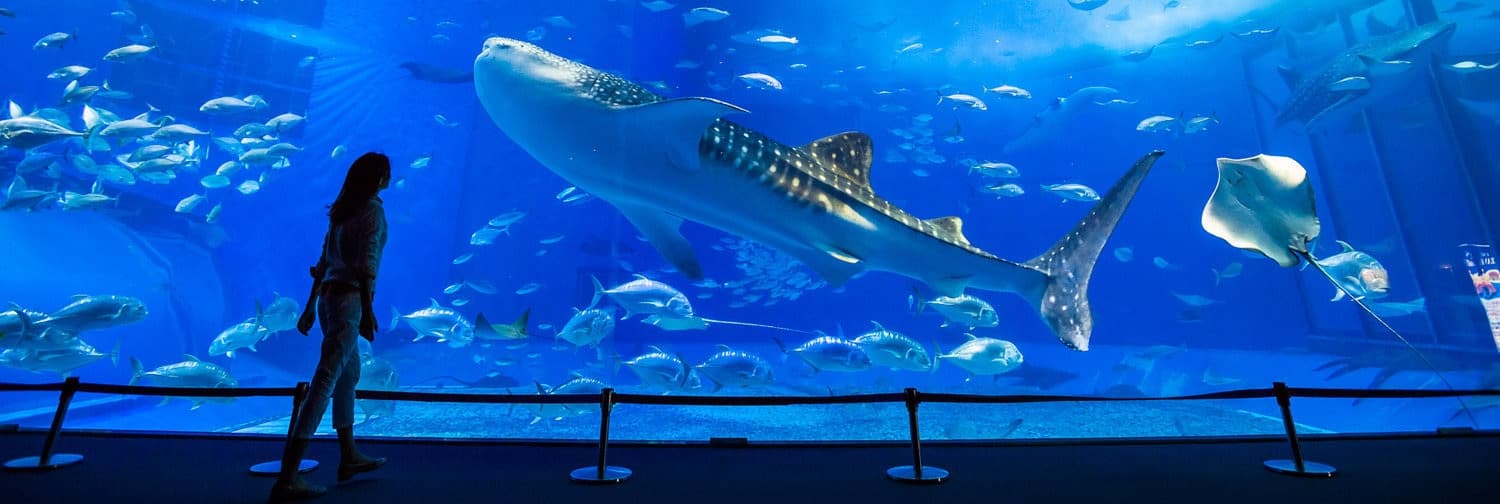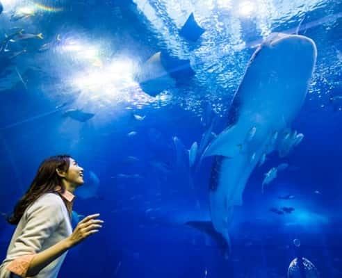 魚類最大のジンベエザメが3尾も泳ぐ、容量7500m³の大水槽は特に有名。