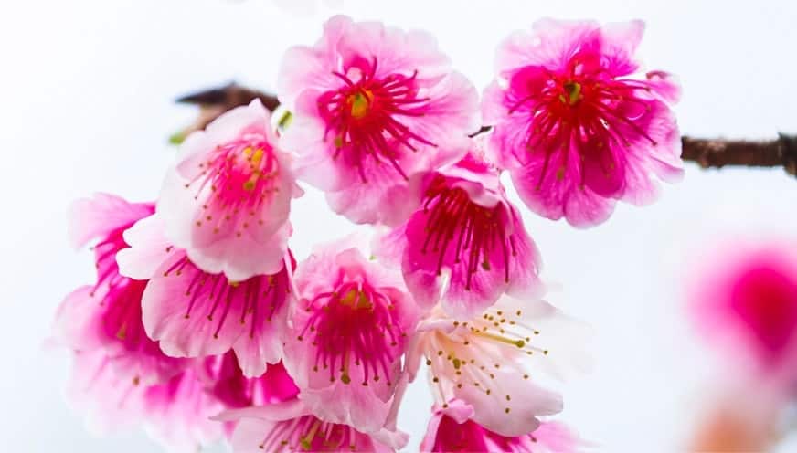 1月、沖縄本島では北部から徐々に緋寒桜(ヒカンザクラ)が開花し、亜熱帯らしさ溢れる濃いピンク色の花を下向きに咲かせる