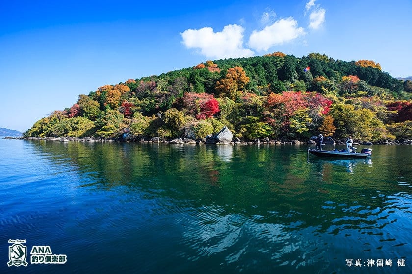 11月 琵琶湖の中央部付近に位置する沖島でのルアーフィッシング。山地に比べ琵琶湖の紅葉は遅く12月に入っても楽しめる。