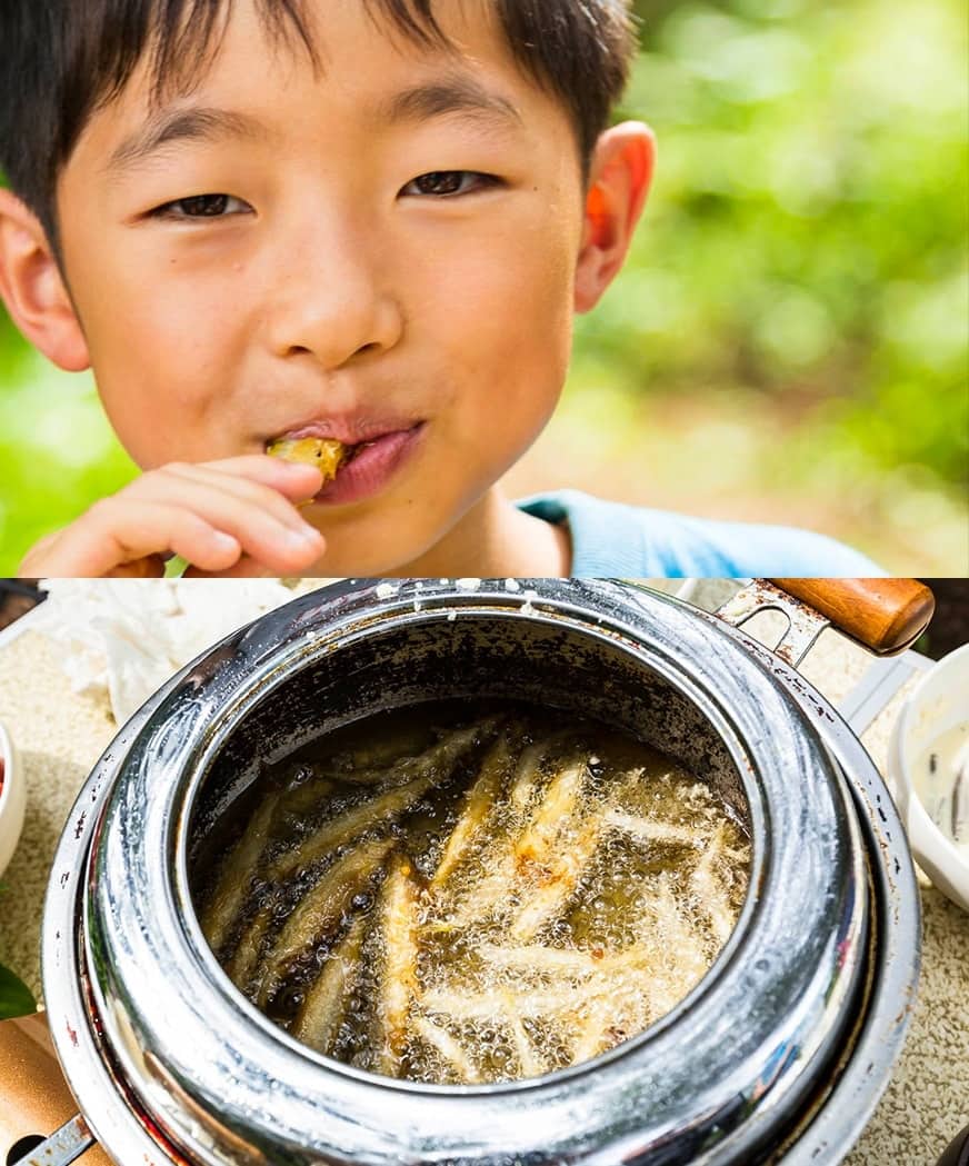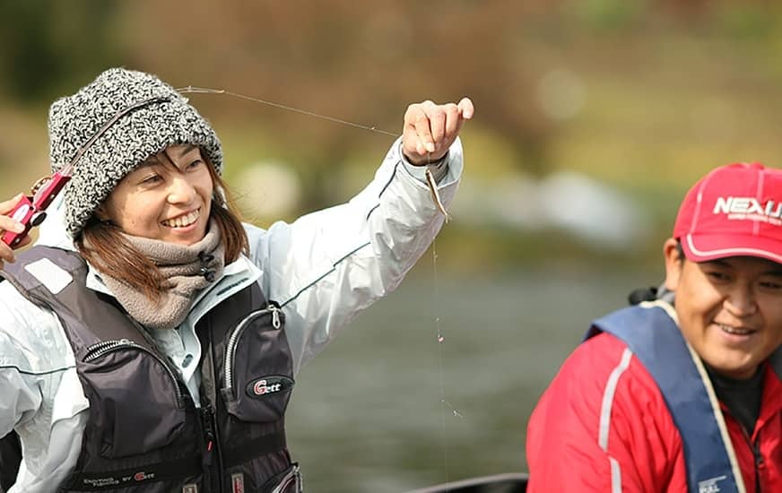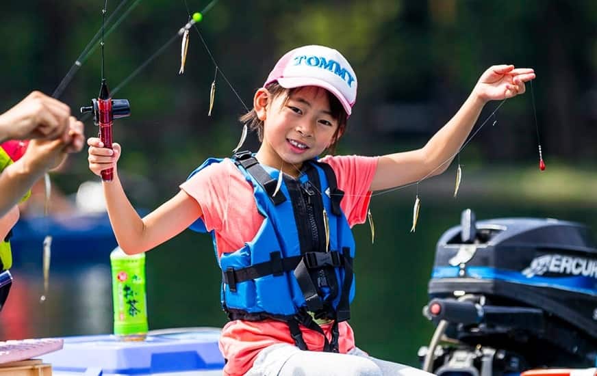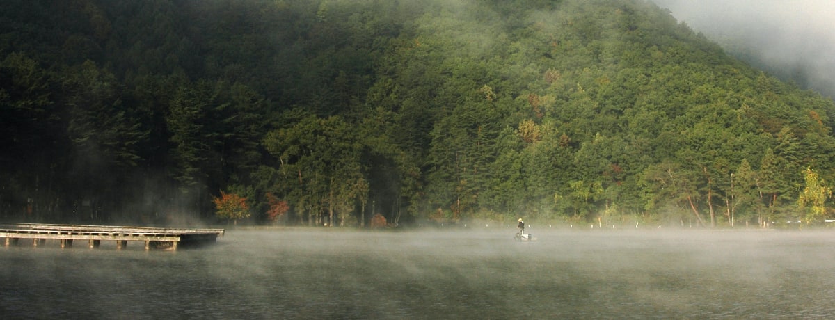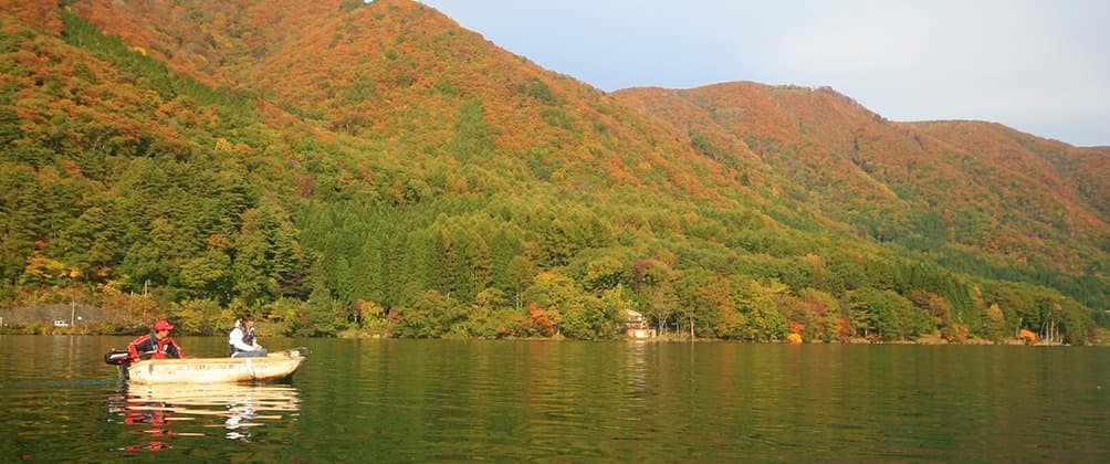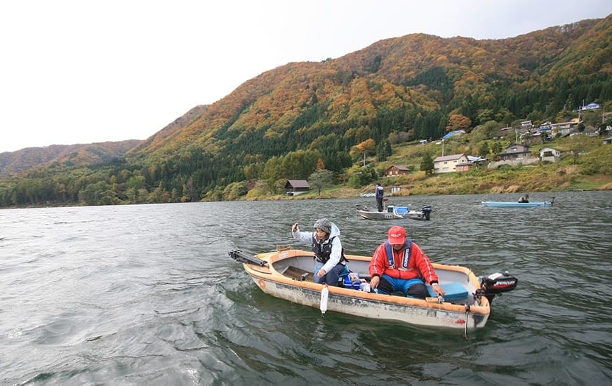 木崎湖の紅葉の見頃は例年10月中旬~11月初旬。赤、黄色に染まった山肌を愛でながら湖上でイトをたれるのはとても清々しい。木崎湖は透明度も高く、水がよいためワカサギの香りがすこぶるよい。秋の8cm前後は骨も軟らかく、空揚げにすると子どもも喜ぶこと請け合い。行楽シーズンは湖畔のキャンプ場(「木崎湖 POW WOW」)がおすすめだ。カヌーやカヤック、サップ(スタンドアップパドルボード)などの水上スポーツも楽しめる。