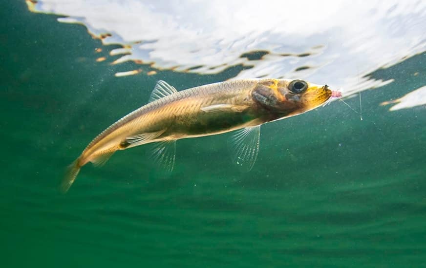 ワカサギ釣りはほぼ通年楽しめるが、ベストシーズンは秋である。というのも、木崎湖は北アルプスに寄り添うように鎮座しているため冬の寒さは厳しく、雪も多い。最深部で30m近くあり、全面結氷はしない。さらに冬場は群れが固まりにくいという。例年、12月には最低気温が氷点下になるので9~11月が最盛期といえる。ワカサギ釣りを最も手軽に楽しめるのは、山の木々が本格的に色づく前。そもそもワカサギは、湖面が結氷するくらい水温が低くてもエサを摂るが、だからといって低水温を好むというわけではない。むしろ冬よりも秋のほうが食欲は旺盛で、魚の活性も高いためにアタリも大きく出る。ワカサギの穴釣りでは通常、サシやアカムシといったエサを用いるが、秋はエサを付けない空バリ仕掛けで釣れることも多い。全くのビギナーでも空バリ仕掛けで100尾、200尾を手にできてしまうのが、秋のワカサギ釣りである。
