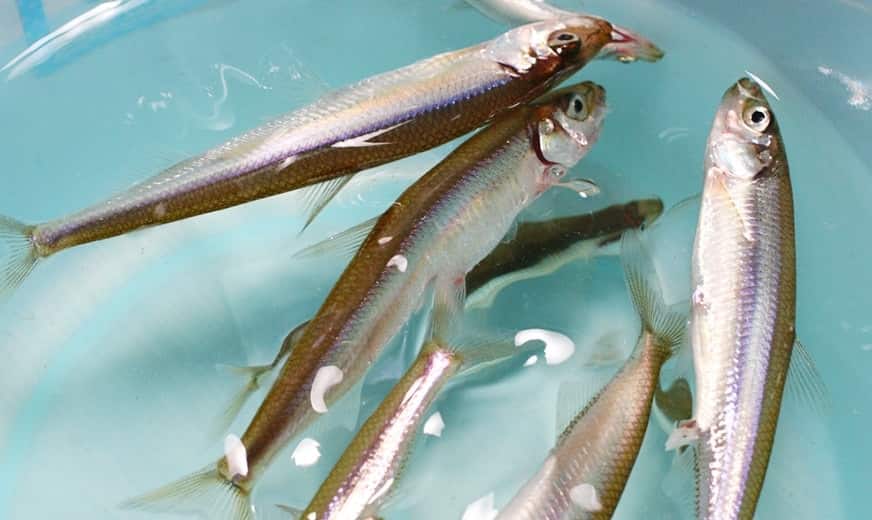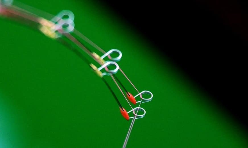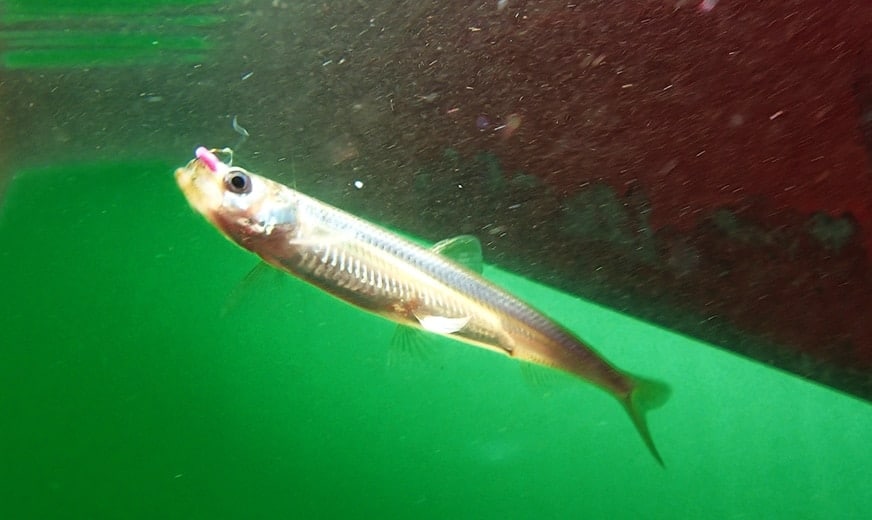 野尻湖のワカサギ釣りの特徴は、最大水深38.5mという、深い湖を釣ることにある。水温が落ちてくる12月や年明けの2~3月がベストシーズンといわれているが、その時に釣るポイントは水深20~25mで、時には30m近くになることもある。それだけに電動リールが有効だ。なお、底ベタに着いたワカサギを釣るので、仕掛けのハリ間隔は短めで、使用するハリの数は5~7本と少なめ。また、置きザオでも魚が掛かりやすい、バレにくい袖タイプのハリを使うとよいといった特徴がある。ハリのサイズは2~2.5号だ。