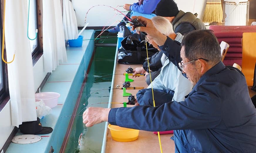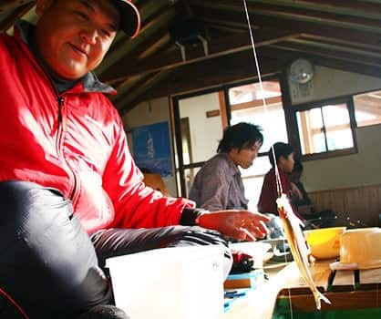 そして、野尻湖のドーム船のワカサギ釣りで、他のフィールドと最も違う点は、多くの人が長い穂先で釣りをしている所にある。平均して60cmという長い穂先を使っていて、その分、釣りをするマスの大きさが他の場所の屋形船よりも広い。