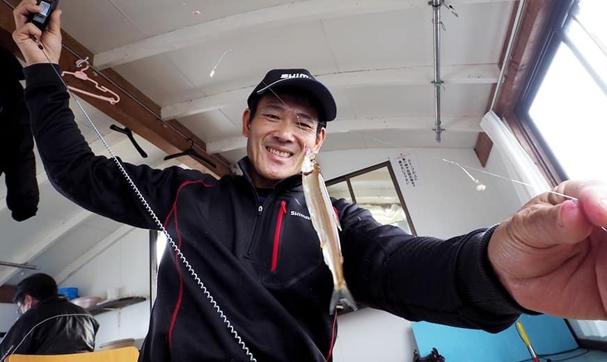 長い穂先を使うのは、深い場所を釣る分、できるだけ1回の投入で多くのワカサギをまとめて掛けたいから。そのために、クッション性があってハリに掛かった魚がバレにくい長い穂先が有利になり、また、前のめりに構えなくてもいいので、着座しているときのアタリも見やすく、疲労軽減にもなる。オモリは深い場所を釣るので、3~5号と重たいものを使う。軽いオモリだと、仕掛けの落下速度も落ちるし、船の揺れで他の人とイトが絡んでしまうオマツリをしやすいからだ。