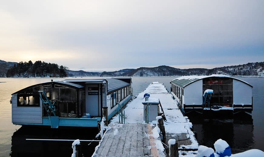周りの山はスキーエリアが多くあるだけに、冬は真っ白な雪の世界に包まれる。外気は日中でもマイナスから上がらない日もしばしば。そんな理由で野尻湖は、冬でも快適に釣りが楽しめ、現地では屋形船と呼ぶドーム船の導入が早い時期から行なわれた。例年の解禁期間は11月1日から翌年の4月の第1日曜日までだ。