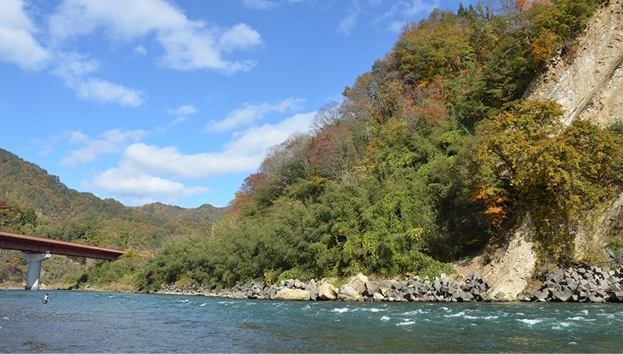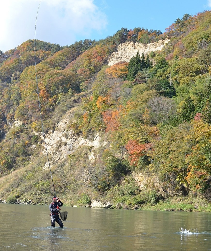 一方、ダムより下流は「犀峡」と呼ばれて景勝地にもなっており、川まですぐに迫った山の間を縫うように流れている。しかもその流れが、いわゆる渓流とは違い、水量豊富な本流と呼ぶにふさわしいようすを保っている。近年、秋の釣り場として注目を浴びているのはこの下流区間。管轄する犀川殖産漁協が「ニジマス釣りの通年解禁」を導入したことで、全国の多くの川では9月で終了するマス釣りが、ニジマスに限っては紅葉シーズンも含めて楽しめるようになった。