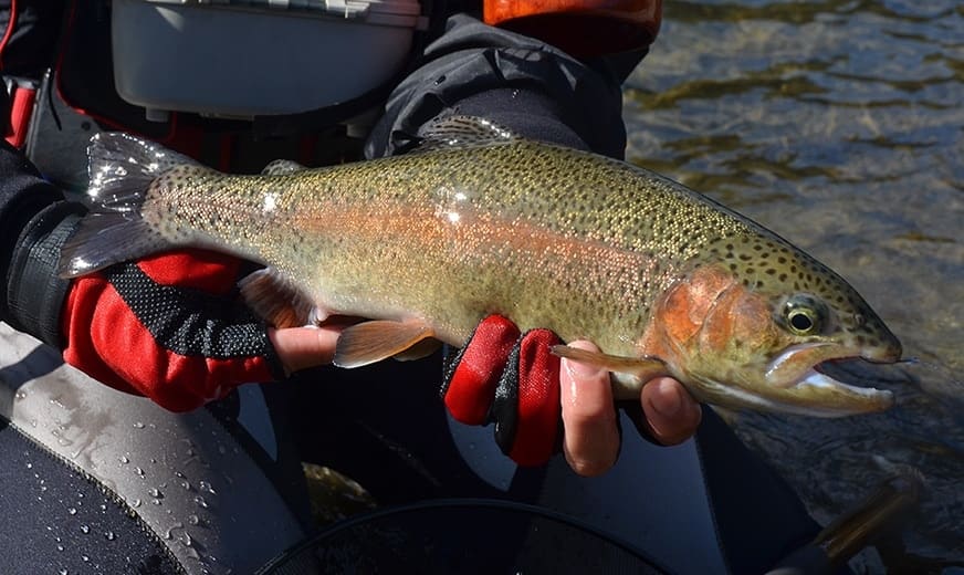 犀川のニジマスは40cmを超える良型が多く、50cm、60cmという大きさも珍しくない。現在、川には人の手を介さず自然に世代交代を重ねている銀色味が強いニジマスと、漁協が定期的に放流している全体に体色の濃いタイプのニジマスの2タイプがいるが、どちらもヒットすれば豊富な水量の流れに乗って疾走し、釣り人を楽しませてくれる。エサ釣りであれば、長尺の本流ザオが満月に曲がるさまは豪快のひとこと。ルアーフィッシングやフライフィッシングでも、両手で扱う大ものようのダブルハンドロッドに力強いマスの引きが伝わってくる。