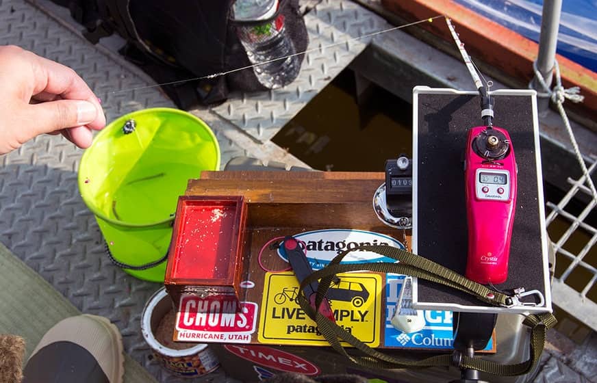 高滝湖の水深は最深部でも4m強と浅く、ワカサギの遊泳層も底層近くに集中することが多い。仕掛けは全長が短いドーム船用の5~7本バリ仕掛けがよく、ハリは秋田キツネや袖と呼ばれるタイプの2号を中心に、1.5~2.5号の大小3サイズをそろえておく。