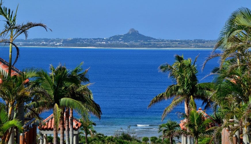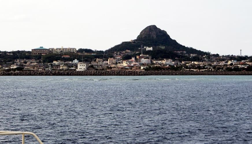 伊江島は沖縄本島北部の本部(もとぶ)半島から、北西約9kmの洋上に位置する離島。美ら海水族館のエレベーターからは正面に見えるとおり、本島からのアクセスがよいのが大きな特徴だ。フェリーの所要時間は本部新港からおよそ30分。船賃は大人で1,370円とリーズナブルである。島の中央部には「イージマタッチュウ」の名で親しまれている標高172mの城山(ぐすくやま)がそびえ、島の南側はフェリーの着き場や漁港で遠浅な砂浜が広がり、北側は断崖絶壁の絶景が広がっている。