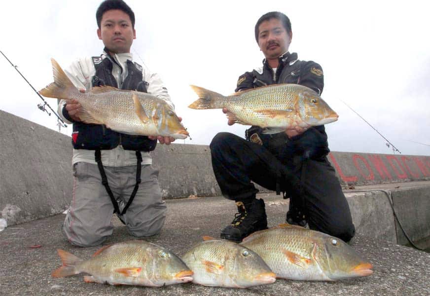 そんな伊江島だが、釣りで訪れても大いに楽しめる。ポイントはいくつかあるが、まずは港の玄関口の伊江港に隣接する「具志漁港」。地元で人気のカーエー(ゴマアイゴ)がねらえる釣り場として知られる。カーエーはアイゴの仲間だが、引きは強烈で沖縄ではベスト3にランクされる人気の魚種。ヒットするとテトラポッドや根に一気に逃げ込むので、ベテランでもなかなか釣りあげることができない。次に「伊江港」。フェリーが到着する伊江港は、昼間にフカセ釣りでニザダイ、イスズミ、ブダイなどが面白い。また、夜はテトラポッドの近くでカーエーもねらえる。さらに伊江港内の「大口(うぶぐち)港」も、長く伸びた突堤の先端付近でカーエーが期待できる釣り場。テトラポッド側ではやはりフカセ釣りでニザダイやイスズミ、夜にはカーエーの大型がサオを絞り込む。そして「西崎漁港」。外海は投げ釣りでタマンやロウニンアジ、大型のハタとオカッパリとは思えないロマンあふれる釣りが楽しめる。一方、内海はウキ釣りでカーエーが釣れるほか、フカセ釣りならニザダイやブダイもヒットする。
