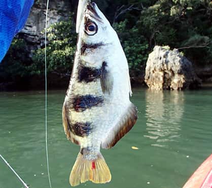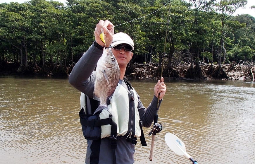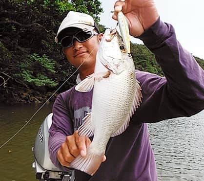 人気魚種のひとつ、マングローブジャックと呼ばれるゴマフエダイは、河口の岩盤帯やマングローブ林の根本に生息し、水面を動かすトップウオータールアーに盛んに反応してくる。また、チヌも人気のターゲット。西表島にはナンヨウチヌとミナミクロダイがいるが、マングローブで釣れるのはほぼナンヨウチヌ。口が小さいので、小さめのルアーでねらう。さらに最大で60cmほどになるパシフィックターポン(イセゴイ)は、ヒットすると盛んにジャンプしてスリリングなやり取りが楽しめる。