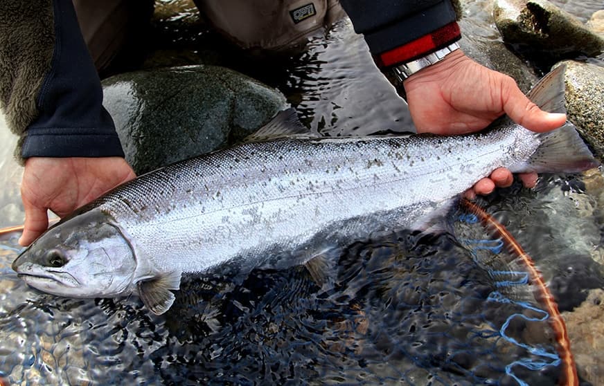 3月 渓流釣りが解禁する蒲田川は例年多くの雪に覆われ白銀の景色が広がる。近隣の温泉から流れ込む水が水温を上げて川面からは霧が立つ。