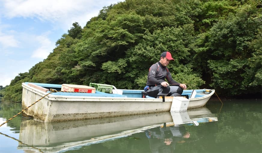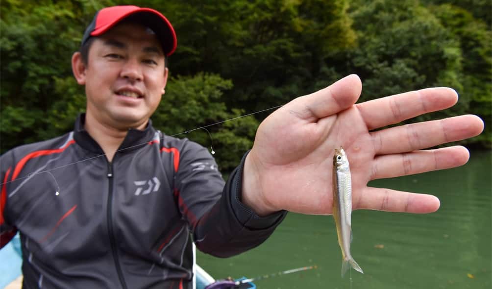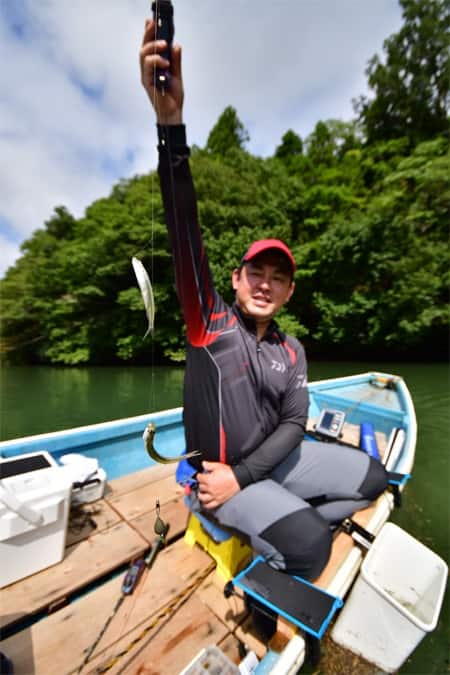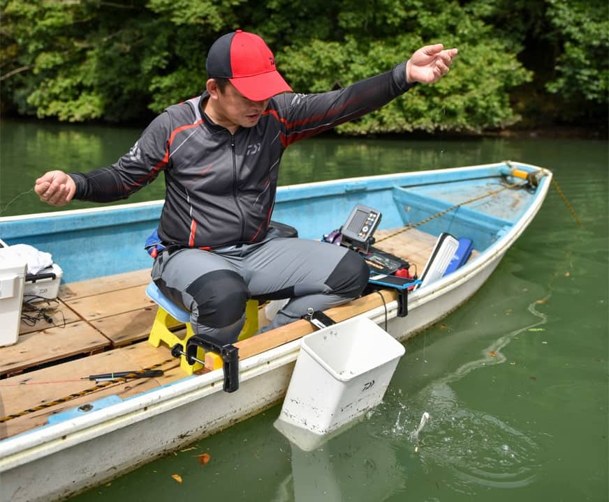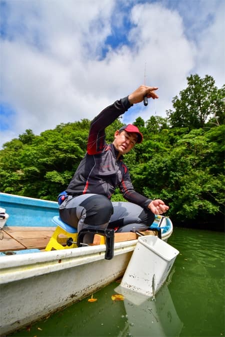 ボートに乗ってポイントに着いたらさっそく釣ってみよう。基本動作はどんな道具を使っていても共通。
