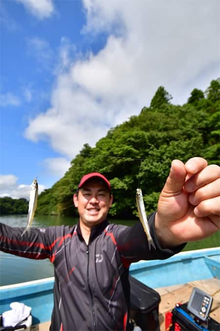 仕掛けを船べりの底まで落としたら5~10cm持ち上げてからサオをチョンチョンと操作して(サオ先を5cm上げてその分下げる)エサを動かす。ワカサギは動いているものに興味を示すからだ。時おり1~2秒動かすのを止めて「食わせの間」を作ることを心掛ける。「食わせの間」とはあらゆる釣りでよく出てくる言葉。釣り人側の動作を止めることでエサを自然に漂わせ、魚がエサを口にしやすい「間」を作るイメージだ(釣りの極意のひとつ!)。