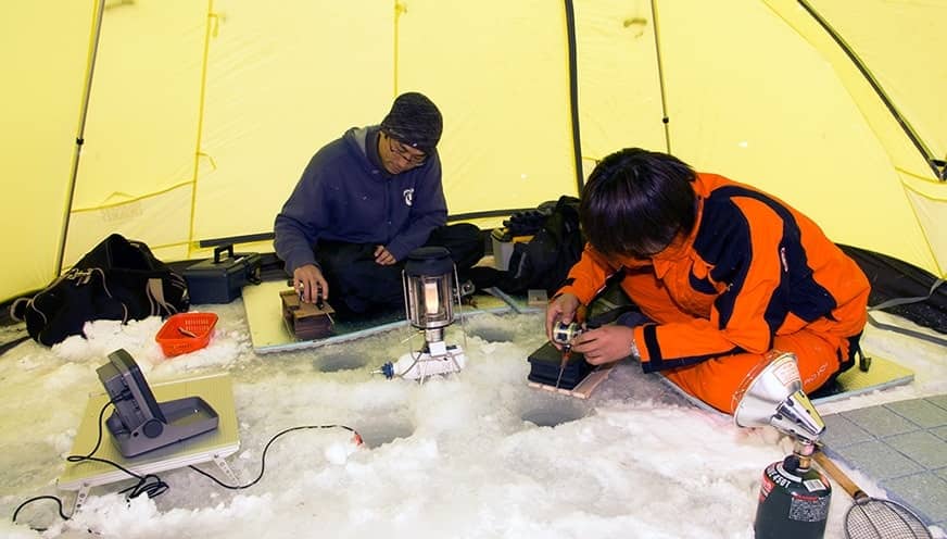 設営作業は時に吹雪の中ということもあるが、テントさえ張り終えてしまえば、極寒の湖とはいっても暖房が効いた内部は別世界。