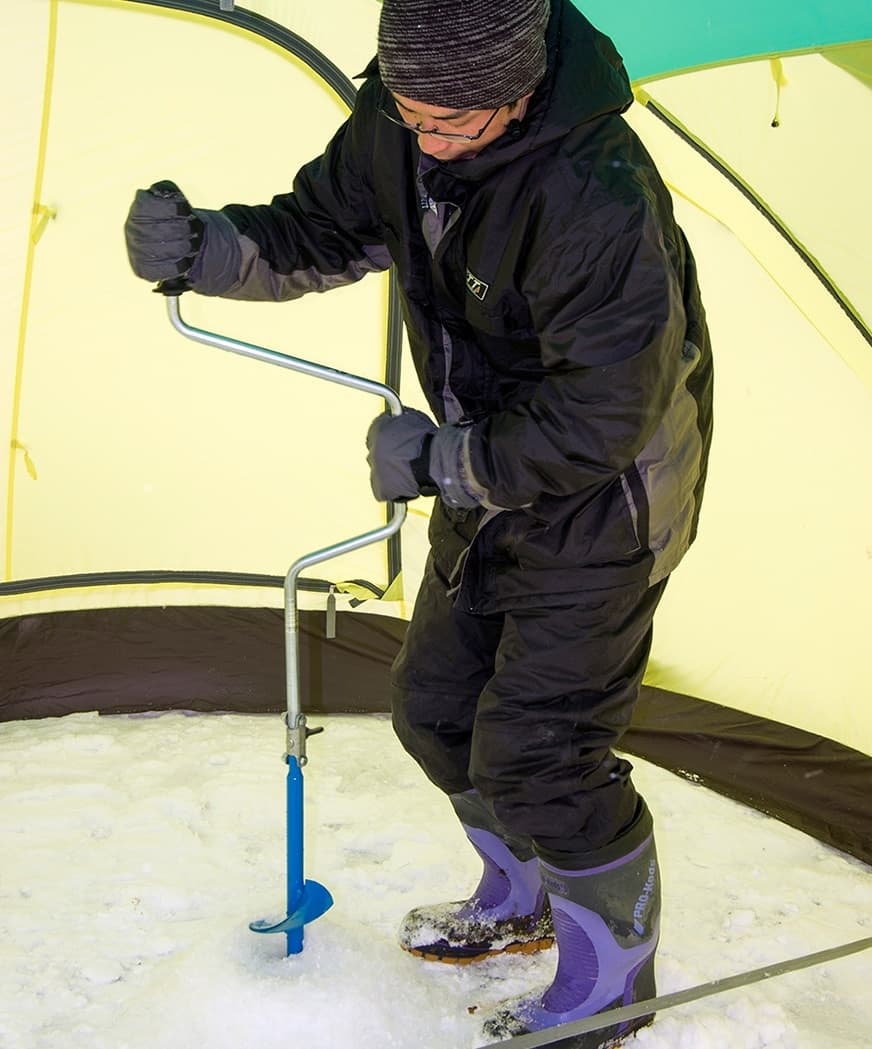 もっこりと着膨れした防寒用アウターウエアは脱ぎ捨て、定番のワカサギ用電動リールタックルを手にして、快適な空間で釣りが楽しめる。