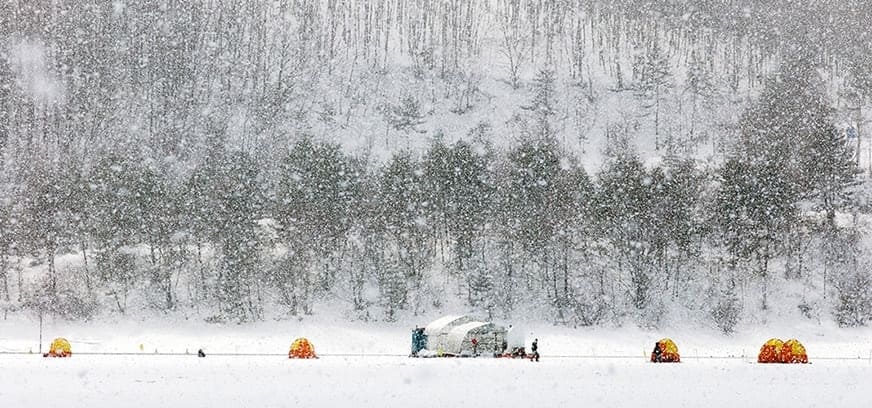 岩洞湖のワカサギ氷上穴釣りスタイルは、自分用のテントを設営することから始まる。タックルや魚探(魚群探知機)のほか、専用のテント、アイスドリル、スコップ、暖房器具などの設営道具をプラスチック製のソリに山積みにし、分厚く張った氷上を歩いてポイントへ向かう。