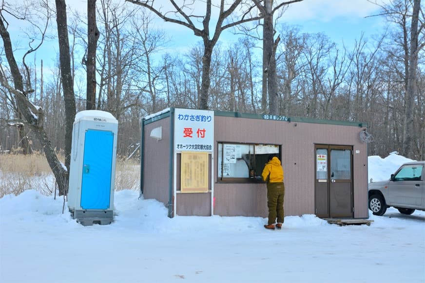 なお、呼人会場より30分早く開場し、車は林道沿いに片側に停める。仕掛け付きの貸しザオは1本500円、エサは200円。手動のアイスドリルは無料で貸し出ししている。