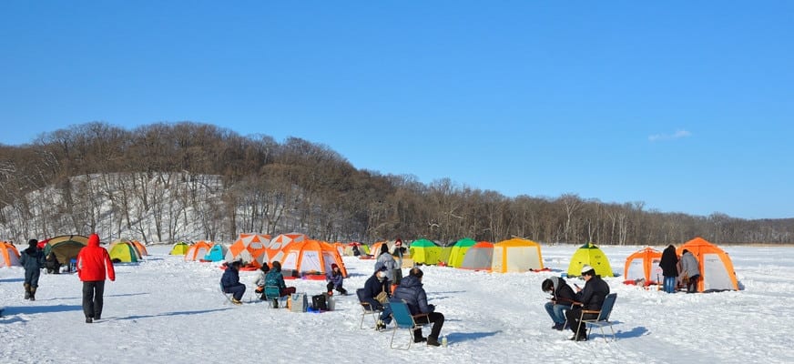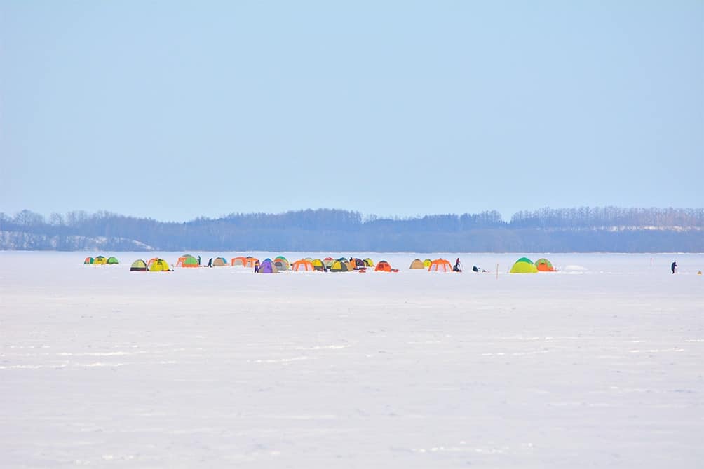 ベテランはテントを設置して10束(1000尾。1束は100尾)を目標にするが、天気がよければのんびりと外でサオをだすとよいだろう。網走湖の魅力はワカサギの魚影の濃さとサイズのよさだけではない。