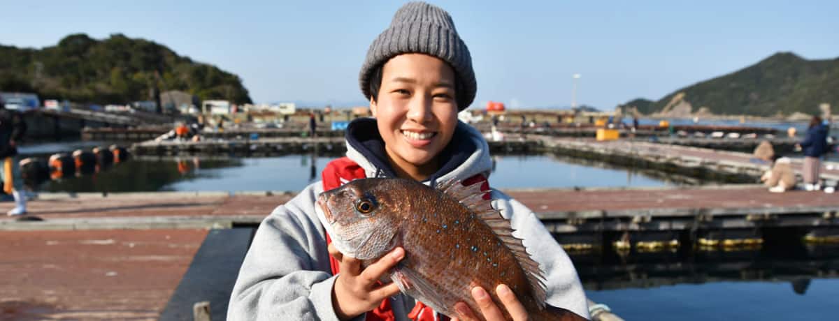 ここで初心者、ファミリーに特に人気なのが「ファミリーコース」。魅力は何より、ふらっと手ぶらで立ち寄っても気軽に釣りが楽しめるところ。イケスには常時マダイが多数放流されており、1人3尾まで釣って、釣った魚はすべて持ち帰ることができる。