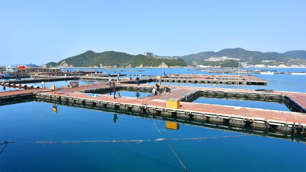その淡路島の南端に位置する南あわじ市の、周りを山と海に囲まれた波静かな湾内に浮かぶ巨大な海上釣り堀が淡路じゃのひれフィッシングパーク。鳴門海峡大橋を臨む大自然の開放的なロケーションに、ただただ癒される。