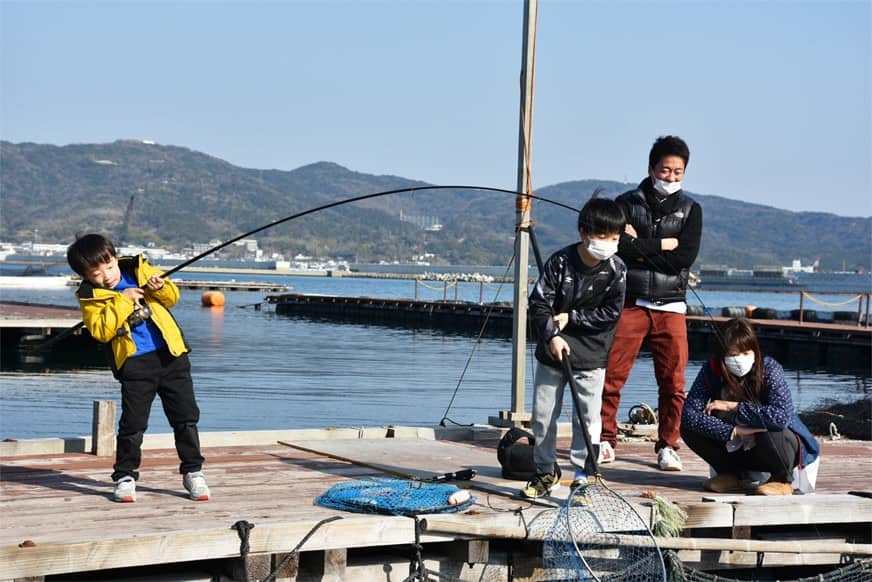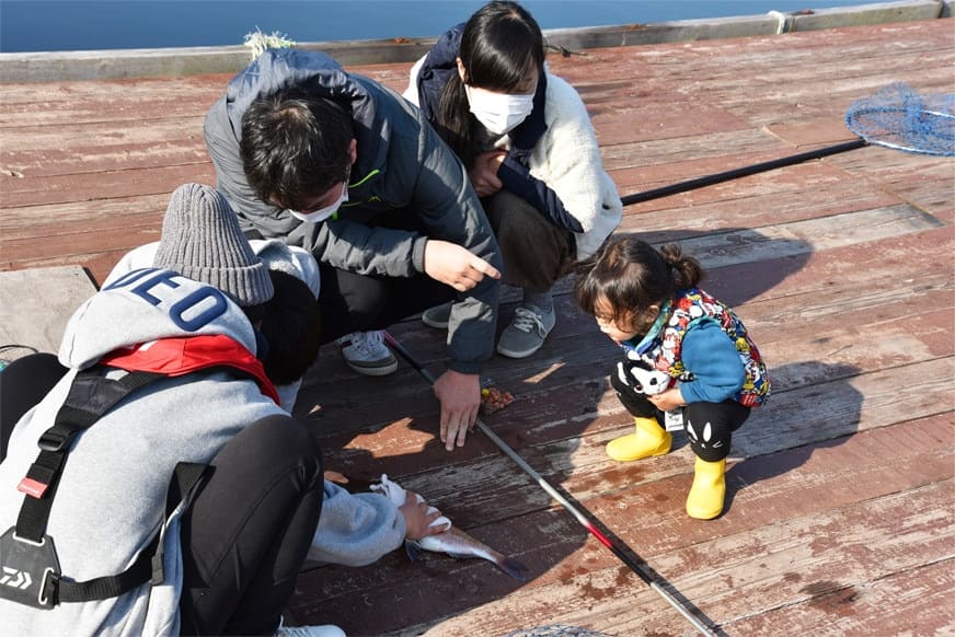 ゴンゴンゴンッと、想像より遥かに力強く生命感溢れるマダイの引き。魚との真剣勝負には大人も子どももとにかく夢中になってしまう。