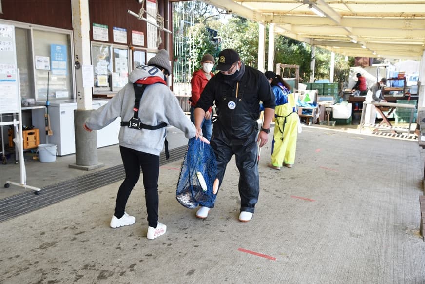 無事3尾のマダイを釣り上げたら、道具を片付け、釣った魚を入れたスカリを受付のスタッフのところへ持っていくのが、ここでの最終工程。