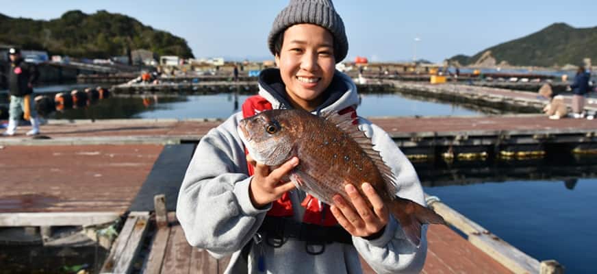 釣りに必要な道具やエサはもちろん現地ですべて調達OK。受付時にスタッフが使い方を教えてくれるから、初めての人でも簡単にマダイのダイナミックな引きを体感できる。