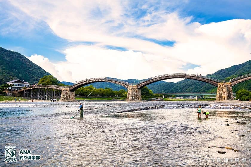 9月 錦帯橋を眺めてアユ釣りをする釣り人の横では、子供たちが川遊びを楽しむ