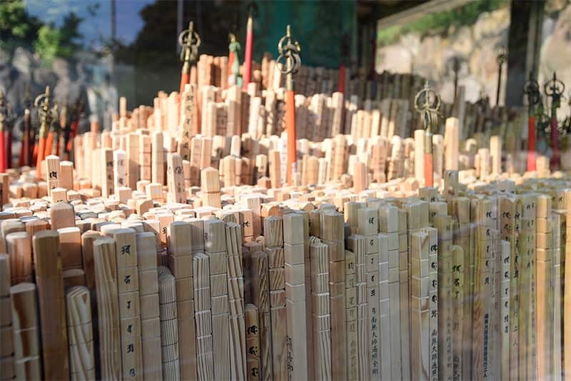 大窪寺の特徴のひとつに、お遍路さんが道中をともにした金剛杖が奉納される寶杖堂があります。金剛杖は、巡礼の間、お遍路さんが弘法大師とともにあることを意味する「同行二人」を象徴するアイテム。最後の霊場である大窪寺で、その役割を終えた金剛杖を納めるのです。